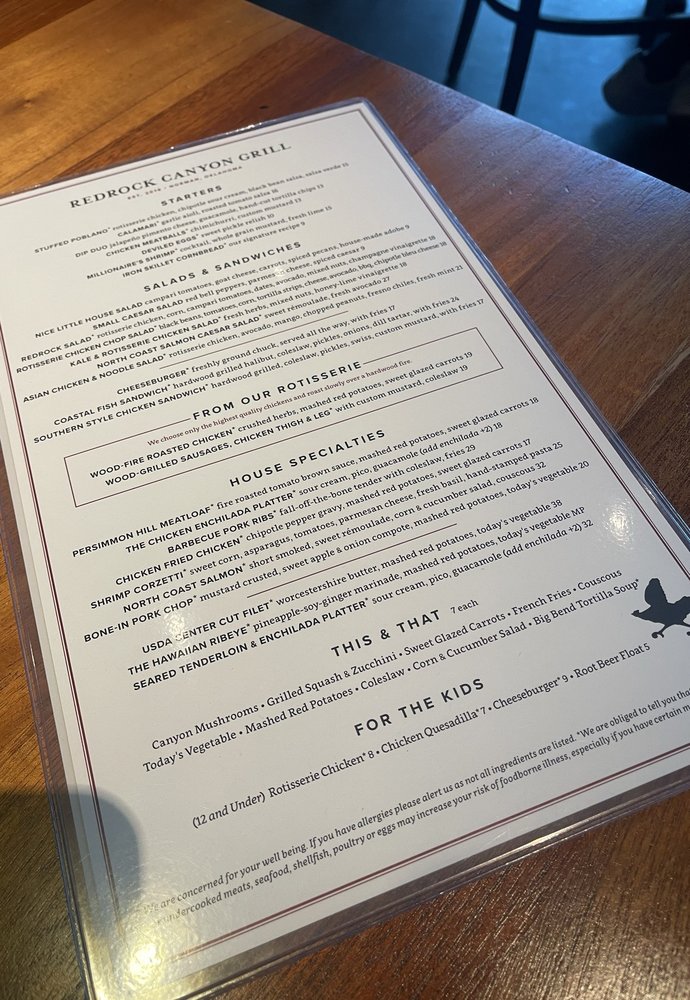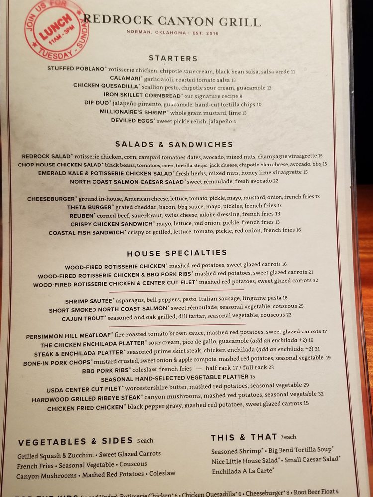Welcome to Redrock Canyon Grill, a delightful American dining destination nestled in Norman, OK. This upscale-casual eatery offers a menu that caters to various palates, featuring house specialties like the Wood-Fired Rotisserie Chicken and Persimmon Hill Meatloaf, each served with flavorful sides that make every bite a treat.